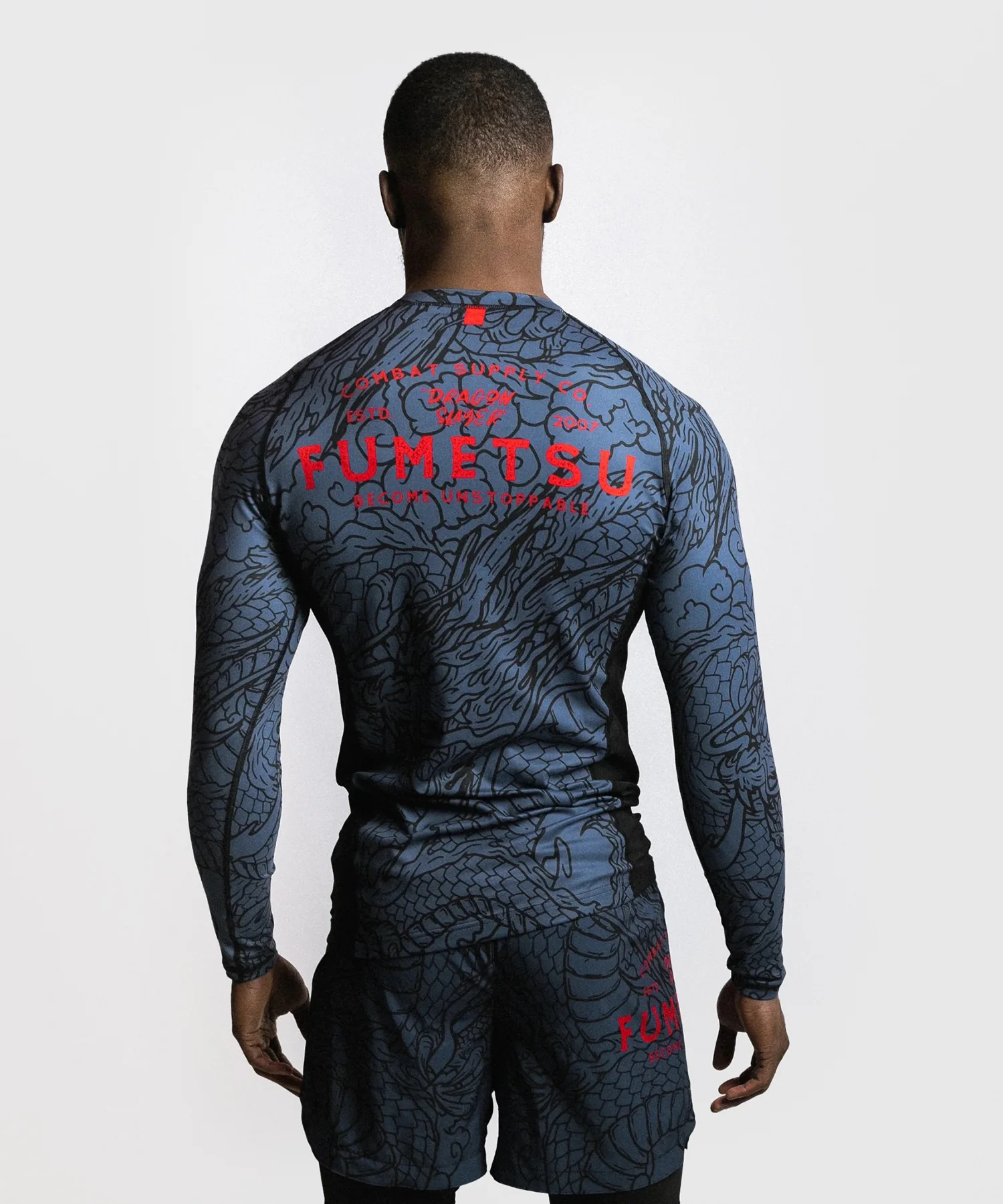 Le Rashguard Manches Longues Dragon Slayer en Bleu/Noir/Rouge présente un motif de dragon intégral saisissant, inspiré par le dragon comme symbole de force et de respect. Les graphiques détaillés se distinguent sur les manches et le dos, complétés par un logo Fumetsu rouge audacieux. Le design au dos inclut un grand logo Fumetsu et le nom "Dragon Slayer" sur les épaules.
